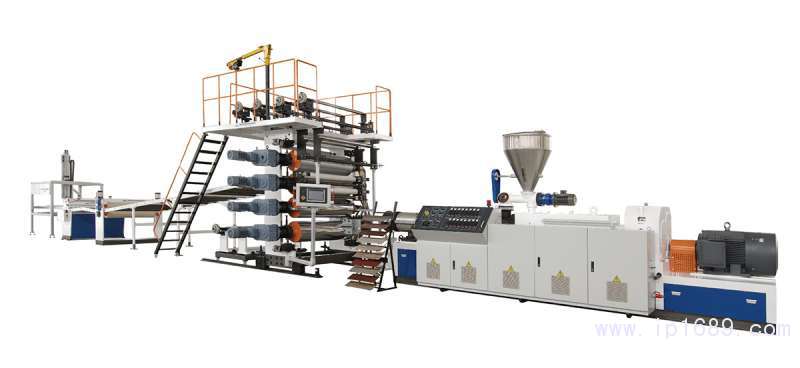 該生產線由供料系統、800/2500高低混合機組、破碎機、磨粉機、擠出復合成型機等組成,具有用場地小、自動化程度高、操作簡便、生產效率高、更換產品快、生產運行穩定可靠、生產成本低、成品率高等優點。其總裝機量約為200KW,可生產寬1300mm,厚度1.5-8mm的復合地板,在SPC復合地板的生產中,該設備首先由擠出機EXTRUDER擠出PVC基材,再用四輥壓延機組分別把PVC彩膜+PVC耐磨層+PVC底膜,一次性壓貼復合生成的產品,工藝簡單、貼合靠熱量完成,不含膠水。SPC地板材料使用環保配方,由UV層、透明耐磨層、印刷裝飾層和PVC硬質層構成,不含重金屬、鄰苯二甲酸酯、甲醛等有害物質,具有綠色環保、輕盈耐磨、防潮防燃等眾多優點,符合EN 14372、EN 649-2011、IEC 62321、GB 4085-83標準。
