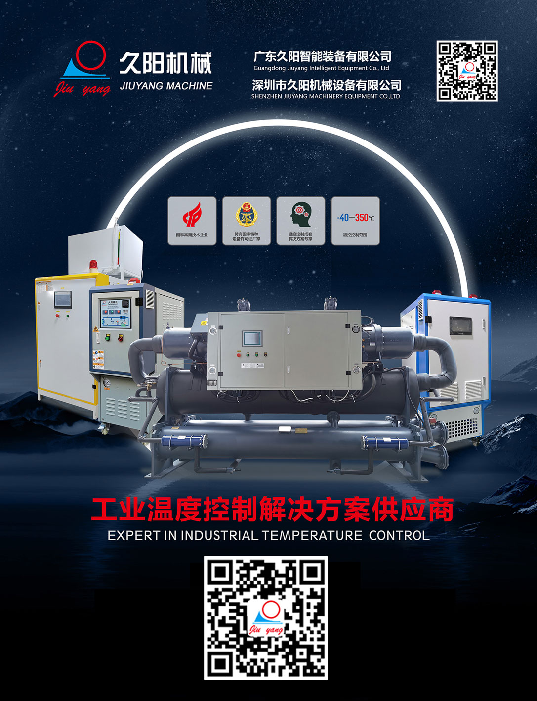 深圳市久陽機械設備有限公司位于廣東省深圳市光明區,久陽工程師及科研人員不斷研究、設計推陳出新后,形成了以模溫機、壓鑄模溫機、水溫機、注塑水溫機、油溫機、模具油溫機、油加熱器、防爆油加熱器、冷水機、工業冷水機、螺桿冷水機、風冷式冷水機、冷熱一體機、導熱油爐、電加熱導熱油爐為核心的設備生產體系。 久陽設備主要用于復合材料成型、新能源電池、鋰電池隔膜、汽車內飾配件、鎂鋁合金壓鑄、化工反應釜、食品制藥行業、橡膠和塑料制品、紡織印染、造紙印刷、烘箱烘房等行業領域。