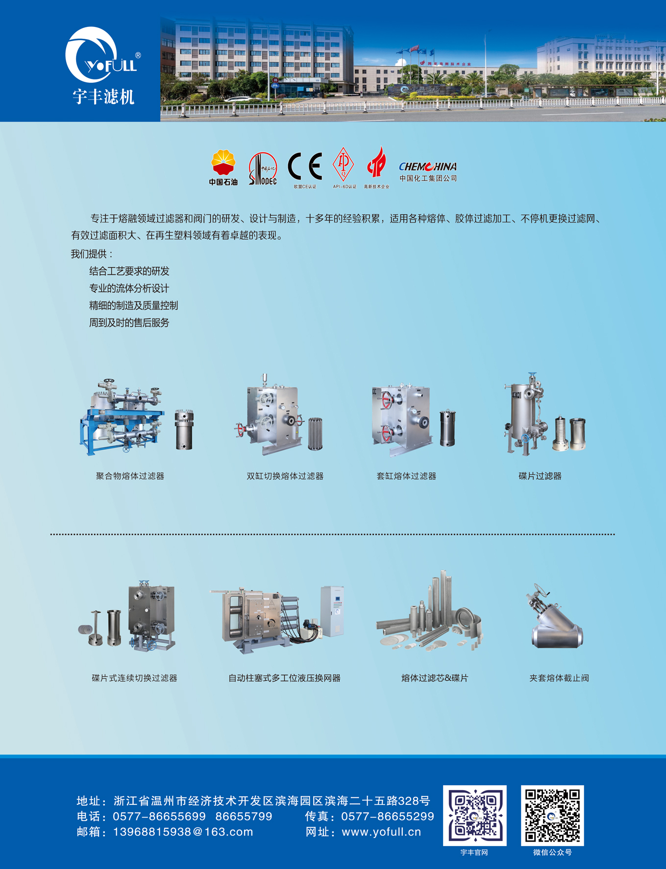 浙江宇豐機械有限公司(前身溫州宇豐機械有限公司)坐落于中國溫州經濟技術開發區濱海園區,是一家集過濾器、濾芯、閥門的研發設計、制造為一體,以卓越管理和廣闊市場為依托、以完善的服務體系為紐帶而形成的精益化機械企業實體。公司目前擁有占地32畝,建筑面積26000平方的花園式、智能化、現代化的工業園。公司同時被溫州市股權運營中心授予“新三板掛牌企業”。
