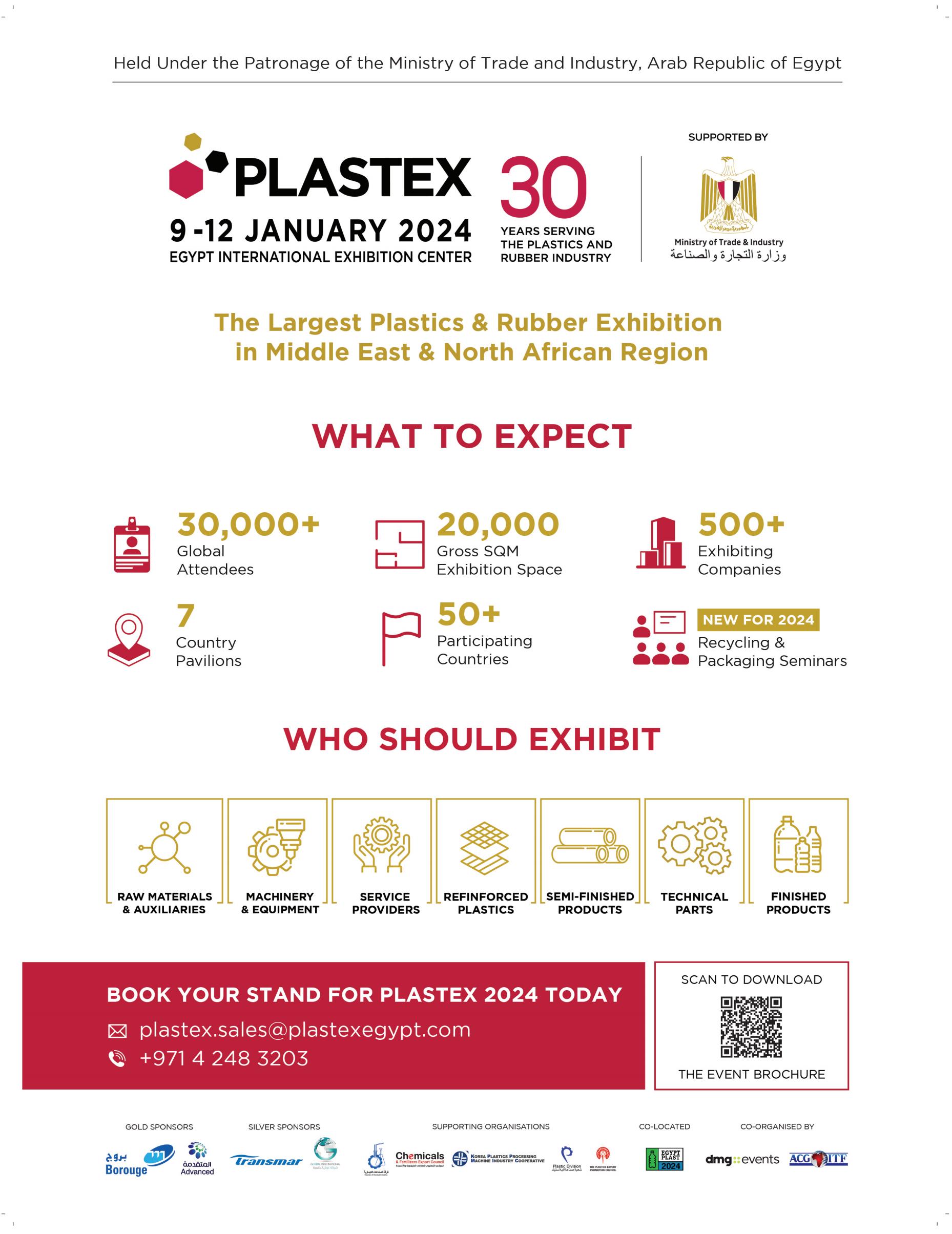 埃及開羅塑料橡膠展覽會(PLASTEX)是北非地區規模大、影響力最廣的塑料橡膠展覽會。創辦于1993年,由非洲展覽組織者ACG-ITF公司主辦,并得到了當地塑料行業協會的大力支持。PLASTEX是埃及最大橡膠塑料機械設備展,同時也是針對中東、阿拉伯、北非及南非市場的專業橡塑膠大展。 埃及開羅塑料橡膠展PLASTEX上屆展會總面積16000平方米,參展企業315家均來自中國、伊朗、迪拜、土耳其、阿根廷、美國、加拿大、南非、印度、墨西哥等,參展人數達12870人。