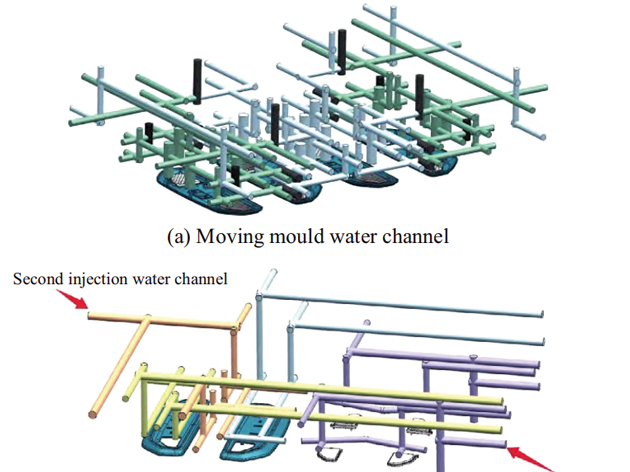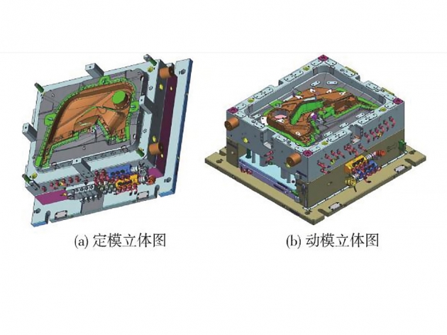 通過對汽車后閱讀燈外殼結構分析,設計出“兩模四腔”的雙色注塑模具。針對第一次注射成型,采用“4點針閥式熱流道+點澆口”的進膠方式,針對第二次注射成型,采用“1點針閥式熱流道+U形冷流道+潛式澆口+輔助澆口...