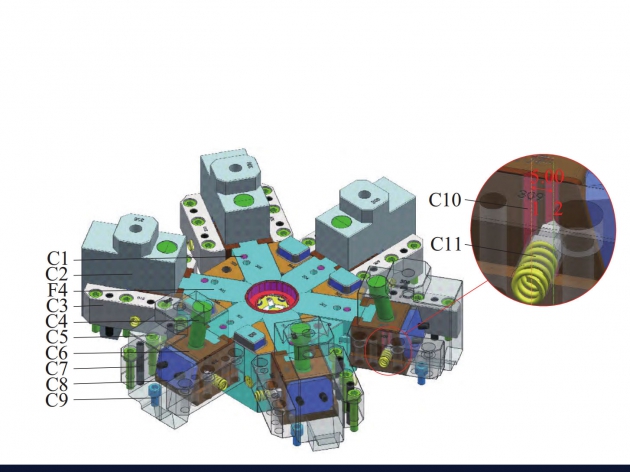 汽車旋鈕作為內飾面板上重要的功能零件,其操作表面常設計為多齒形結構并采用電鍍后處理工藝,以賦予產品獨特的人機交互體驗。為了順利成型脫模,齒形結構的成型應設計多向抽芯機構,并嚴格控制行位分型段差,以...