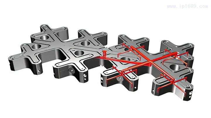 熔融樹脂流經封閉熔體通道而形成的流動路徑用紅色標記