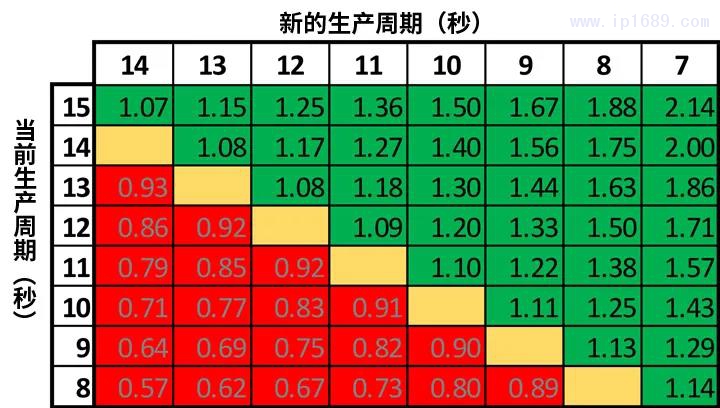 縮短生產周期可以增加產量。一些注塑生產環境和工具室還貼著宣傳海報,上面寫著:“將生產周期從10秒減至9秒,產量增加11%。”要估算生產周期變化對產出的影響,請用當前時間除以所需時間(以相同單位)。這給出了一個在任何時間范圍內都能使用的乘數。下方表格提供了生產周期和所得出的乘數。增加的產量以綠色突出顯示,減少的產量以紅色顯示。