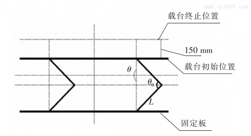 為了驗證曲臂長度是否滿足設計要求,為運動仿真提供初始條件,必須確定兩曲臂相交位置水平的初始和終了位移,因此需要建立機構的運動方程。另外,為了確定氣缸輸出壓力,需要建立機構的受力方程 。根據實際情況,提出以下幾點設計要求:開合尺寸為 300 mm;成型面積不得小于 750mm×600mm;合模壓力不小于0.5 MPa;空動作循環小于 4s。載臺位移簡圖與單個曲臂受力簡圖分別如圖 3、圖4 所示。
