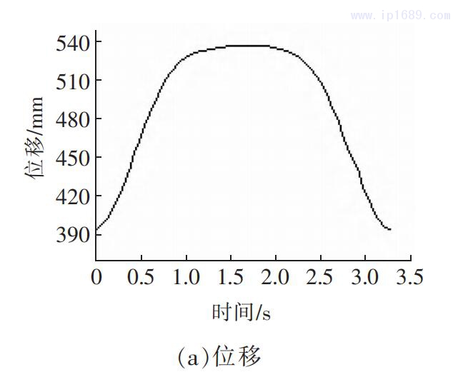 由圖 7(a)可以看出,上支承座最大位移變化為148.4 mm,接近開合尺寸的一 半 。從圖 8(b)可以看出 ,曲臂在運動過程中會發生速度突變 ,具有較大慣性 。與閉模過程相比 ,曲臂在開模的過程中,由于重力的作用其慣性更大 。針對這種情況 ,在實際使用中,可以適當增加成型結構的工作循環時間,即通過使用泄氣閥適當減少氣缸力的輸出,輔助開合模過程 ,以減小機構慣性力 。如果從幾何參數方面進行優化改進 ,相應的制造成本會增加 ,因此,適當減小氣缸壓力是較好的改進方法。模擬實驗還發現,曲臂與氣缸的夾角在 0~1.5 s 內從141.05°變成 90.24°, 符合設計要求。
