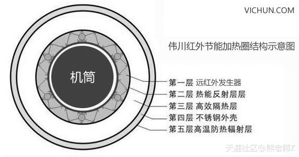 目前也有叫做納米紅外電熱圈、遠紅外加熱圈、納米加熱圈等,其本質就是紅外線加熱圈,其典型代表企業包含了VICHUN偉川紅外節能加熱圈、NEZOY納米紅外電熱圈、AIKSEN納米紅外電熱圈。當紅外節能加熱圈的電阻絲通上交流電后,其自身已變成遠紅外輻射熱源,具有高強度、高熱效、高穿透性、低能耗等特點,并且,利用紅外輻射加熱技術不論是對被加熱工件還是對環境都沒有污染。因此,高紅外輻射加熱管是一種真正意義上的“綠色產品”高紅外輻射加熱管的工作原理是:電流在通過以特殊材料制成的加熱管的加熱絲時,加熱管會輻射出一定波長的紅外線,當紅外線被物體吸收時,物體即被加熱。利用這一特性來加熱物體的技術就叫做紅外輻射加熱技術。由于不同材質的物料對不同波長的紅外線的吸收程度不同,為了適應不同的加熱對象,通過改變加熱絲的材料成分和繞制方法,可以產生不同波長的紅外線輻射?,F在,用于工業用途的紅外輻射主要是波長0.76~1.6μm左右的短波、波長1.6~4μm左右的中波和波長大于4μm的長波。短波紅外輻射又叫近紅外輻射,中波和長波又叫遠紅外輻射。由于紅外輻射的熱慣性極小而熱效率很高,利用短波、中波紅外輻射技術,可以高密度、高能量、高強度地對工件(這里所指為炮筒又叫機筒)進行加熱,以達到提高加熱質量、縮短加熱時間、節約加熱能源。目前市場上知名度較高的偉川紅外節能加熱圈加熱溫度可達500---700度,其遠紅外發射率可達90%以上,同時偉川紅外節能加熱圈的紅外輻射源材質匹配了目前注塑機采用的鉻鉬合金鋼材質的物理特性,使得該品牌節能加熱圈相對其他同類產品具有更佳的節能效果。