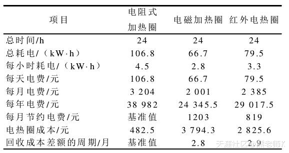 上述數據表明,雖然電磁加熱圈與紅外加熱圈較電阻式加熱圈初期的投資成本很高,回收投資成本差額的周期約3個月左右,但節能的經濟效益還是比較可觀的。