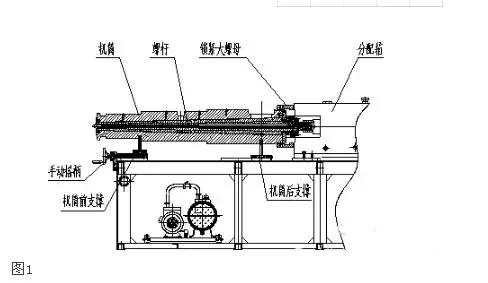 1) 將前后支撐裝上機筒后與螺桿(裝入機筒)一起放上主機機架,先不裝鎖緊大螺母,搖動前支撐手動搖柄將機筒向分配箱方向移動看機筒止口與分配箱唇口是否在同一水平高度,初步判斷此機筒是否達到加工精度。如圖1所示。