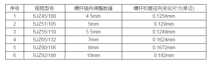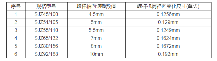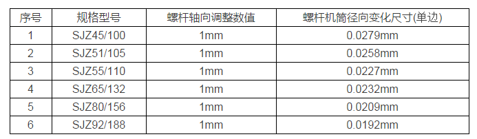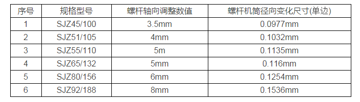 不同規格錐雙主機螺桿軸向竄動1mm螺桿機筒徑向變化尺寸: