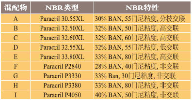 混配物A到I(表2和表3),有幾個明顯趨勢。總的來說,相比混配物F至I(線性NBR聚合物基),混配物A到E(交聯NBR基)顯示出較高的拉伸和模數,更好的壓縮變形和耐磨性能。在100℃70小時的IRM903油老化試驗后,使用較高BAN型NBR導致更佳的耐油性。同時也注意到混配物A是基于枝化交聯型,而混配物D是基于低量化學交聯。