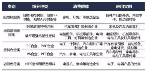 根據改性后的功能,改性塑料包括阻燃樹脂類、增強增韌樹脂類、塑料合金類、功能色母類等種類,各個種類按著不同的材質又可以細分下去,并且由于各自的性能差異,應用領域也各有不同。