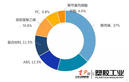改性塑料在汽車工業的作用和地位越來越明顯,目前聚丙烯(PP)、丙烯腈—丁二烯—苯乙烯共聚物(ABS)、聚酰胺(PA)、聚碳酸酯(PC)、聚甲醛(POM)、聚對苯二甲酸丁二醇酯(PBT)、加強型聚氨酯(PRT)和聚氯乙烯(PVC)等塑料都在汽車上得到了廣泛的應用。在所有的車用塑料中,聚丙烯所占份額最高達37%,其次是聚氨酯,占比17.3%,ABS樹脂占12.3%,復合材料占11.5%,高密度聚乙烯占10.8%,聚碳酸酯占6.8%,聚甲基丙烯酸甲酯占4.4%。