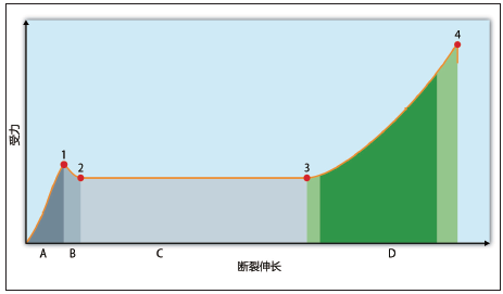 圖2 收縮膜的伸長表現,主要伸長區(A)、峰點(C)和工作區(D)(來源:Polifilm)