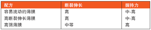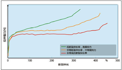 圖3 薄膜在低斷裂伸長率和高握持力;中等斷裂伸長率、中等握持力和極高斷裂伸長率時的拉伸強力-斷裂伸長示意圖(來源:Polifilm)