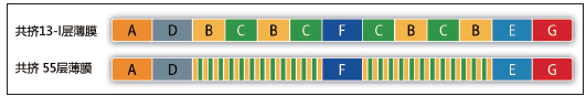 圖4 共擠13和55層薄膜的層結構:擠出機A、D~G,各層厚度占總厚度的10%,擠出機B和C,各層厚度占25%(來源:Polifilm)
