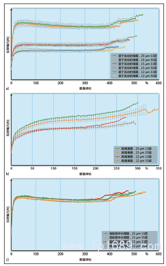 圖6 13層和55層薄膜的拉伸強力-斷裂伸長圖。a) 厚度為12、15、23μm的易流動薄膜;b)12、15 μm的高強薄膜;c)高斷裂伸長薄膜,厚度15、 23 μm (來源:Polifilm)