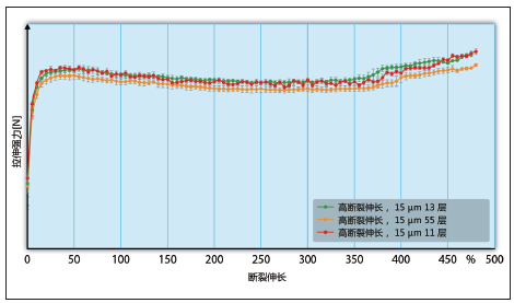 圖7 15微米厚的11層、13層和55層的高伸長率薄膜的拉伸力 - 伸長率圖(來源:Polifilm)