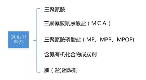 含氮阻燃劑主要包括3大類:三嗪類化合物三聚氰胺、雙氰胺、胍鹽(碳酸胍、磷酸胍、縮合磷酸胍和氨基磺酸胍)及它們的衍生物,特別是磷酸鹽類衍生物。