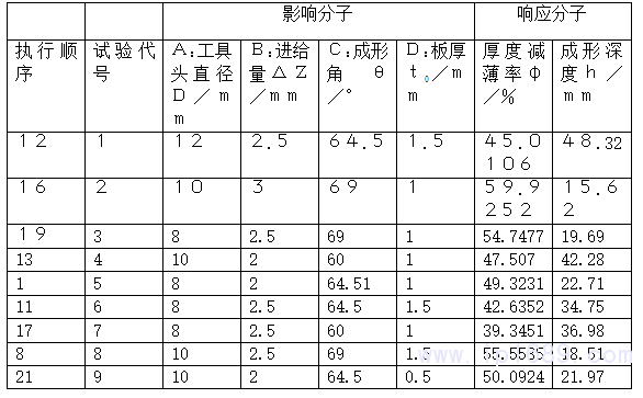 將成形工具頭直徑D?進給量ΔZ?成形角θ?板厚t0作為分析因子,將厚度減薄率Φ和成形深度h作為響應因子[9]?由于漸進成形工藝中進給速度v對成形質量影響較小[10],在節省時間的前提下,進給速度v設置為2500mm/min?