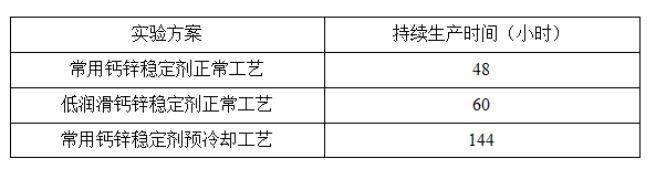 采用相同的配方,采用不同的鈣鋅穩定劑,一種為常用鈣鋅穩定劑,一種為穩定劑廠家特制的低潤滑鈣鋅穩定劑,同時比較正常工藝與預冷卻工藝的不同時生產的持續時間。