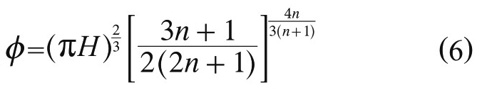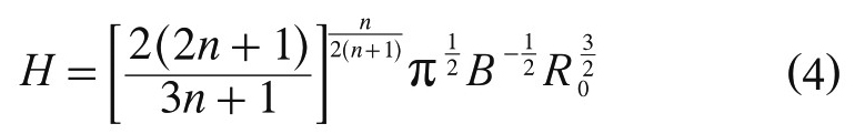 衣架式流道主要由歧管區、扇形區和模唇區3 部分組成。衣架式流道的設定參數為:(1)流延膜的目標產量G(kg/h);(2)模具口模的設置半寬B(cm);(3)配方物料的密度ρ(g/cm3);(4)模具口模的設置厚度h(cm);(5)物料的非牛頓指數n。根據圖1與相關文獻[9],得到以下相關計算公式。