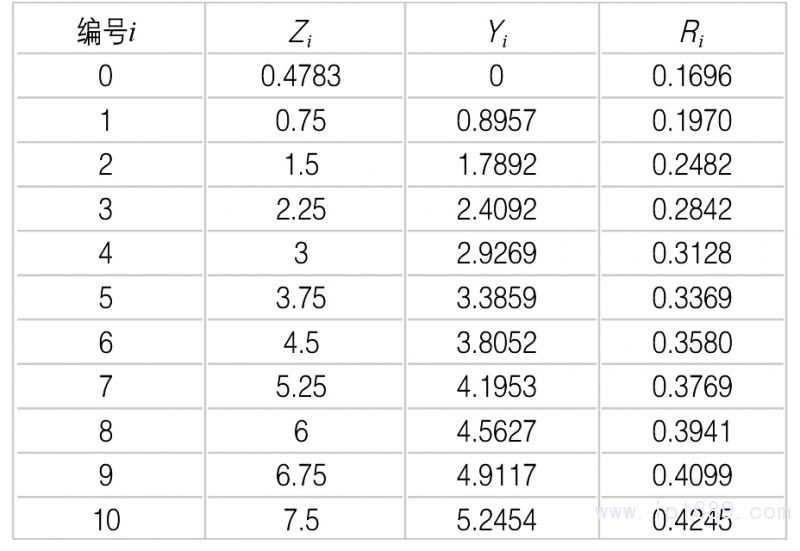 入口孔半徑為RH=0.6003 cm,中心歧管最大半徑為R0=0.4245 cm,扇形區槽高為H=0.1889 cm,穩壓區高度為Y0=0.1764 cm,流道的扇形區中心軸處最大高度值為Yc=5.2454 cm,若將口模的半寬B分成10份,則每一坐標點(Zi,Yi )所對應的歧管孔半徑值Ri如表1所示。