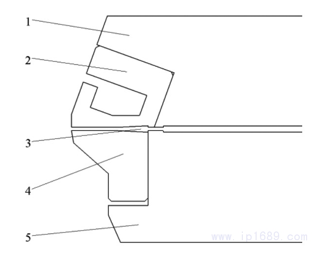 1-上模板;2-上??冢?-凹槽;4-下???;5-下模板