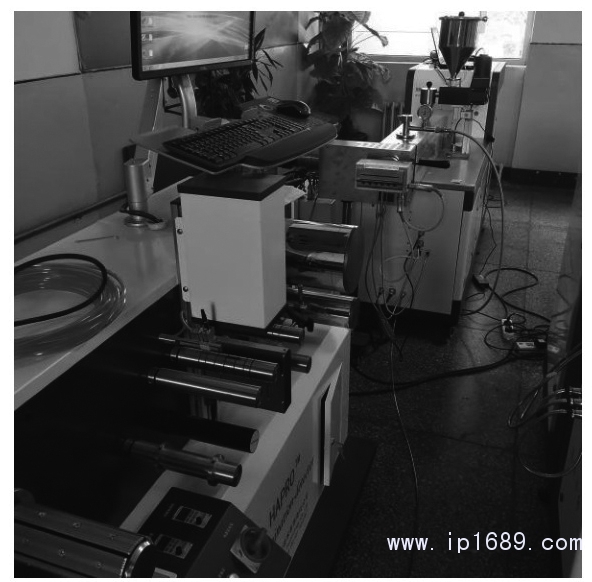 搭建流延模具實驗裝置,如圖13所示,從流延模具擠出的流延膜溫度較高,由兩輥壓光機進行壓光、冷卻定型,并可調整流延膜的厚度。