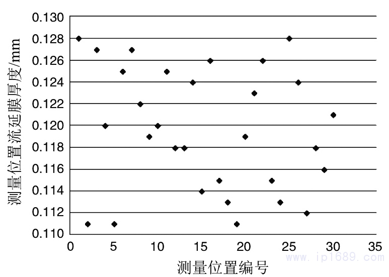 對實驗得到的流延膜選取30個位置進行厚度測量,得到流延膜厚度測量圖,如圖15所示,加工得到的流延膜厚度最高為0.128 mm,最低為0.111mm,其正負偏差小于8%,滿足流延膜厚度規范。