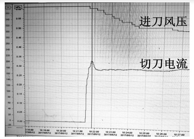 圖2擠壓機開車時切刀電流及進刀風壓與時間的趨勢圖