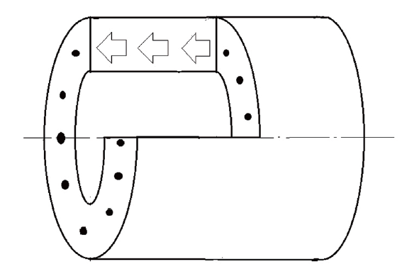 主要熱塑性塑料管材的成型,傳統方法為擠出成型。如上所述,在擠出成型過程中,熔體流動方向與管材軸線平行,大分子鏈也平行于管材軸線取向,管壁的強度是平行于管材軸向大于垂直于管材軸向。為提高塑料管材性能,賦予其新的功能,常對塑料管材外表面進行修飾加工,以提高塑料管材的強度、韌性、彈性模量,或阻氧性、防靜電及導電性、阻燃性等。傳統的擠出涂覆方法,熔體流動方向也是平行于管材軸線的,如圖1所示。