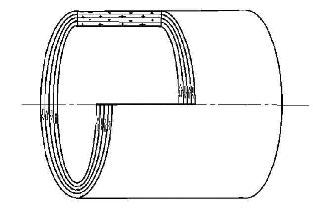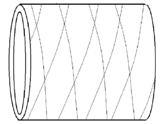 熱塑性塑料管材的生產過程是靠牽引機的牽引力將管胚引出口模進入定徑冷卻裝置的,在牽引力的作用下,導流板形成的兩股相向而行的熔體流將繞芯棒呈螺旋軌跡被拉伸形成了網狀,可稱為交叉復合。螺旋角的大小由擠出速度與牽引速度之比確定,其中環向強度等于軸向強度的2倍的螺旋角(交叉復合角)為理想的角度。圖6中成品管實際為四層結構,四層中的大分子鏈沿管材園周取向,如圖6所示。