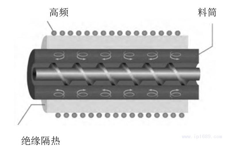 電阻加熱是通過接觸傳導方式把熱量傳到料筒上,只有緊靠表面內側的熱量傳到料筒上,外側的熱量大部分散失在空氣中,存在熱傳導損失。電磁加熱是使金屬料筒自身發熱,并在料筒外部包裹一定的隔熱保溫材料,大大減少熱量的散失,提高熱效率,節電效果顯著[5-6]。所以,電磁加熱比電阻加熱更為節能、高效。擠出機上應用電磁加熱技術相對于傳統電阻加熱方式的主要優勢主要體現在以下幾個方面: