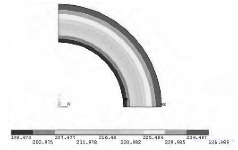 讀取加熱500s時擠出機料筒的溫度分布如圖5所示。從料筒的溫度分布圖可以看到料筒的內外溫差非常的小,加熱效率非常高。分析結果表明,環狀效應使電磁加熱技術在擠出機料筒加熱上具有非常高的效率、溫度上升也很高,這對擠出機系統的溫度控制非常有利。