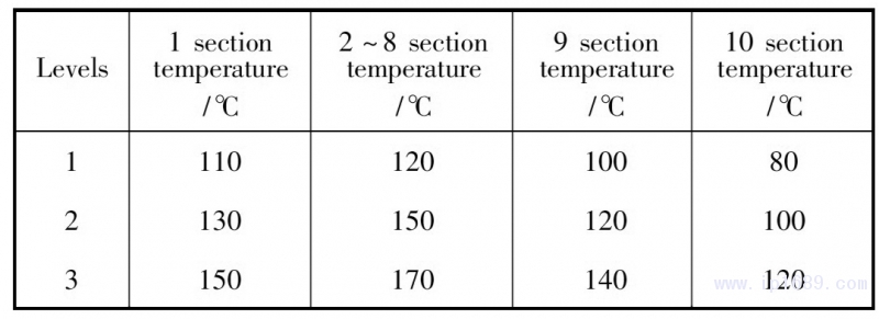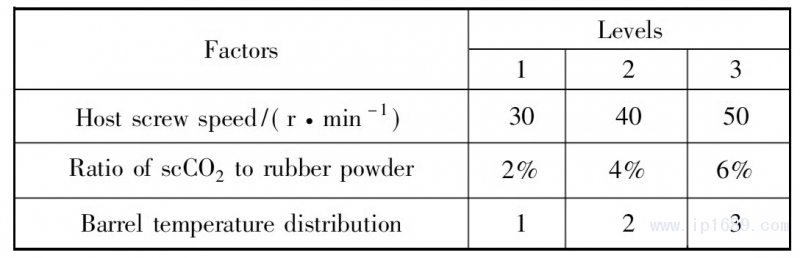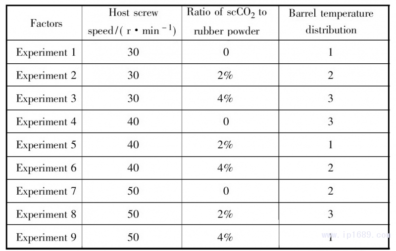 2.2.3 正交實驗設:正交實驗是一種高效、快速、經濟的實驗設計方法,其結果具有試驗次數少、試驗點分布合理、試驗結果信息量大,結果分析具有統計性質等優點。本文設計三水平三因素的正交實驗,探究主機螺桿轉速、超臨界流體與膠粉質量比,以及機筒溫度 排布對廢舊橡膠再生效果影響的強度。試驗因素水平表如Tab. 3所示。