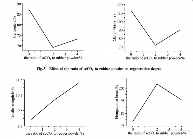 Fig.6 Effect of the ratio of scCO2 to rubber powder on physical and mechanical properties of recycled rubber