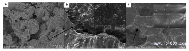 Fig.8中的照片展示的是a膠粉、b未通過超臨界流體制備的再生膠以及c超臨界流體作用下再生膠在放大2000倍下的微觀形貌。由Fig. 8a可以看出,廢舊膠粉的表面粗糙,而且存在凹凸不平的孔洞,由Fig. 8b、Fig. 8c 可以看出,硫化后的再生膠表面為連續均勻一致的連續體,連續體的形成說明再生過程中廢舊膠粉中的交聯網格被打斷,形成大量分子鏈,交聯網格斷裂形成的分子鏈有更強的自由移動能力,再生膠在硫化過程中形成質地相對均勻的連續體,因此再生后的膠粉表面更為均勻一致。對Fig. 8b、Fig. 8c局部進一步放大可以看出連續體的表面存在些許小粒徑圓點,小粒徑圓點是由于存在部分膠粉沒有充分再生,交聯網格包裹著填料維持再生之前的形態,因此表面存在小粒徑圓點,通過Fig. 8b和Fig. 8c的對比可以看出,通入超臨界流體制備的再生膠表面更為光滑,再生膠表面有少量的小粒徑圓點,這說明超臨界流體的通入有利于廢舊膠粉的再生。微觀表面的裂縫是由于在脆斷過程中,低溫環境造成的應力大于分子鏈之間的相互作用力形成的破壞,根據裂痕的深度以及大小可以說明具有良好再生效果的再生膠分子鏈之間的相互作用力更為穩定。
