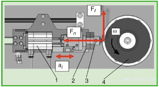 圖3、ICCA測量原理示意圖,包括:氣動裝置(1),兩軸負載單元(2),固定架加撞擊器(3)和圓形橡膠試樣(4)