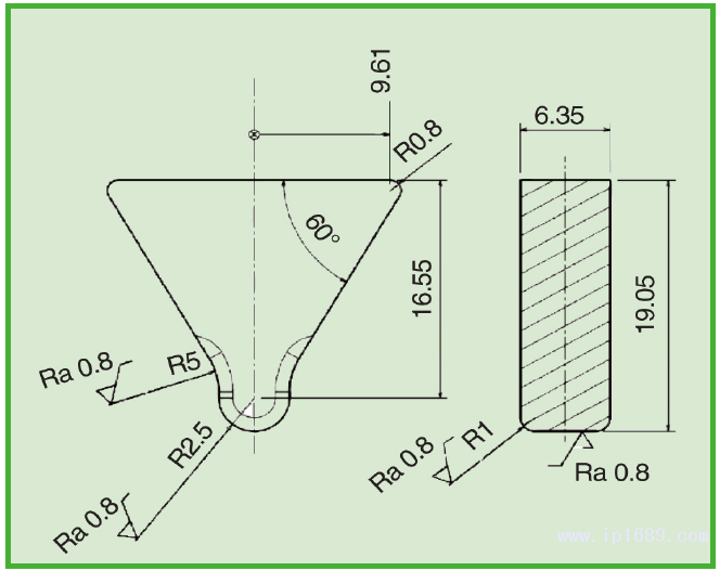 圖4、不銹鋼撞擊器具的幾何形狀。撞擊器的寬度是6.35毫米,撞擊13毫米厚的橡膠樣品的中間