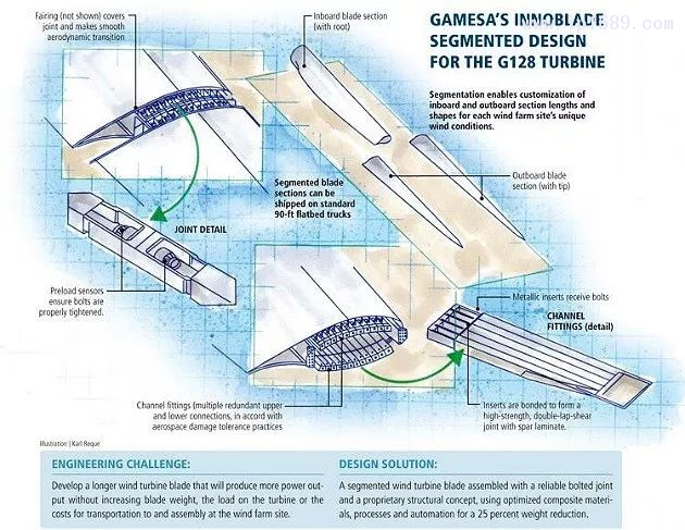 當葉片在運行時,它必須看作為一個整體的葉片,有一個連續的彎曲和沒有平坦的斑點,以避免破壞空氣動力學和負荷。節段使用接頭內的插入螺栓連接。這些刀片是金屬的,并在葉片層壓板結合,使他們形成一個雙搭剪接頭,被航空航天業界認為是粘合連接在復合材料結構里最強烈的選擇之一。