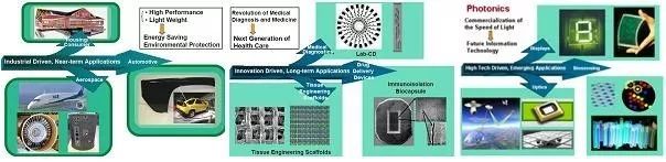 納米復合材料的一些應用和相關研究在世界各地的研究中心得到了很好的應用。這些項目包括用于汽車、航天和國防結構的納米復合材料;聚合物納米復合泡沫;用于光學應用的納米復合材料;導電納米復合材料用于腐蝕防護、能量儲存和轉換裝置;用于組織工程腳手架、防護裝甲和生物傳感的納米纖維;以及相關的納米顆粒和納米復合材料的生命周期分析。