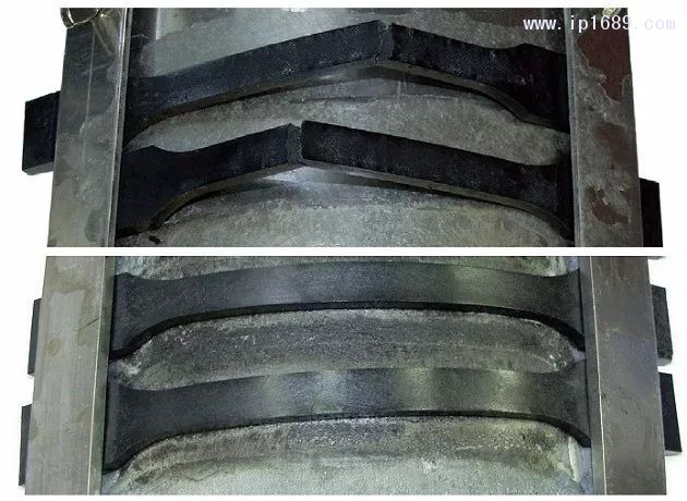 用燒堿溶液浸濕彎曲夾具后的PBT GF30測試棒。無改善應力抗裂性能的材料快速斷裂(頂部);