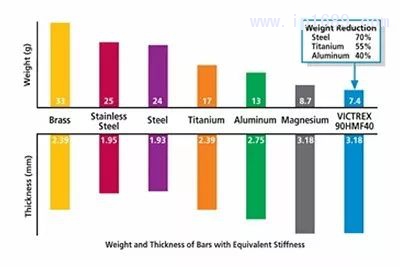 Victrex Plc的新型聚醚醚酮(PEEK)樹脂是另一種可靠的減輕重量的材料。在PEEK材料中加入高模量纖維(HMFs)提供了在汽車和工業應用中取代鋼鐵、鋁、鈦、黃銅和鎂等金屬所需的強度和剛度。新的Victrex PEEK HMF聚合物是基于Victrex 90系列配方,用于模塑堅韌的薄壁零件。