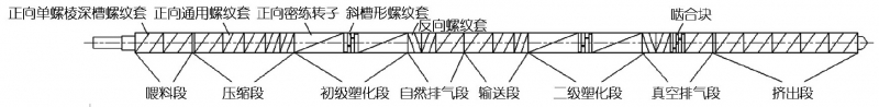 顧名思義,反向螺紋套輸送物料的方向必然與螺桿輸送物料的方向相反,從而迫使物料向回運動,加大了物料在擠出過程中的周向流動,延長了物料在熔融段的停留時間,從而使物料在密煉轉子、斜槽形螺紋套區域內進行反復地分布性混合和分散性混合。物料欲通過反向螺紋套,必須在正向螺紋套入口前建立起一定的壓力,以壓力流的形式通過反向螺紋套。該高壓由前段的正向螺紋套來建立,因此通過在喂料段設置單螺棱深槽螺紋套來增大自由體積比,使得物料充滿螺槽,從而建立起足夠的壓力,使得物料順暢輸送。