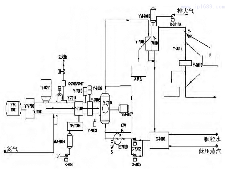 筒體、節流開車閥(YM-7002)、熔融泵及電機(YM-7004)、換網器(Y-7005)、切粒機(Y-7007)、液壓油系統以及粒料處理系統等組成(圖1)。