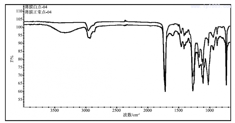 薄膜尺寸偏移,薄膜表面有大量凸起半透明晶點,晶點附近都發生明顯孔洞。于是我們針對晶點做了集中搜集,表面處理后的晶點做了點紅外分析測試,測試結果見圖 1。