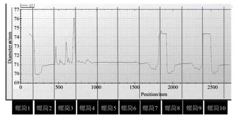 圖 3 測試結果顯示,在第二節螺筒到第三節螺筒處發現有大于 1mm 的磨損。