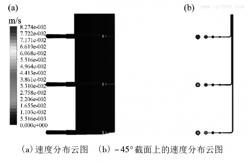 圖6a為整體速度分布云圖,圖6b為XY平面繞Y軸旋轉-45°截面上的速度分布云圖。由圖可知,共擠出流道壁面上的速度幾乎為0(10 -5~10-4m/s),較好地接近壁面無滑移假設。
