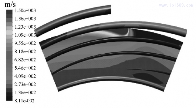圖7為第一層熔體層分配流道對稱平面上的速度分布云圖。熔體受到壁面的粘附作用,沿螺旋槽徑向速度降低;隨著螺旋槽徑向尺寸不斷減小,流動截面逐漸變小,沿螺旋槽軸線方向,